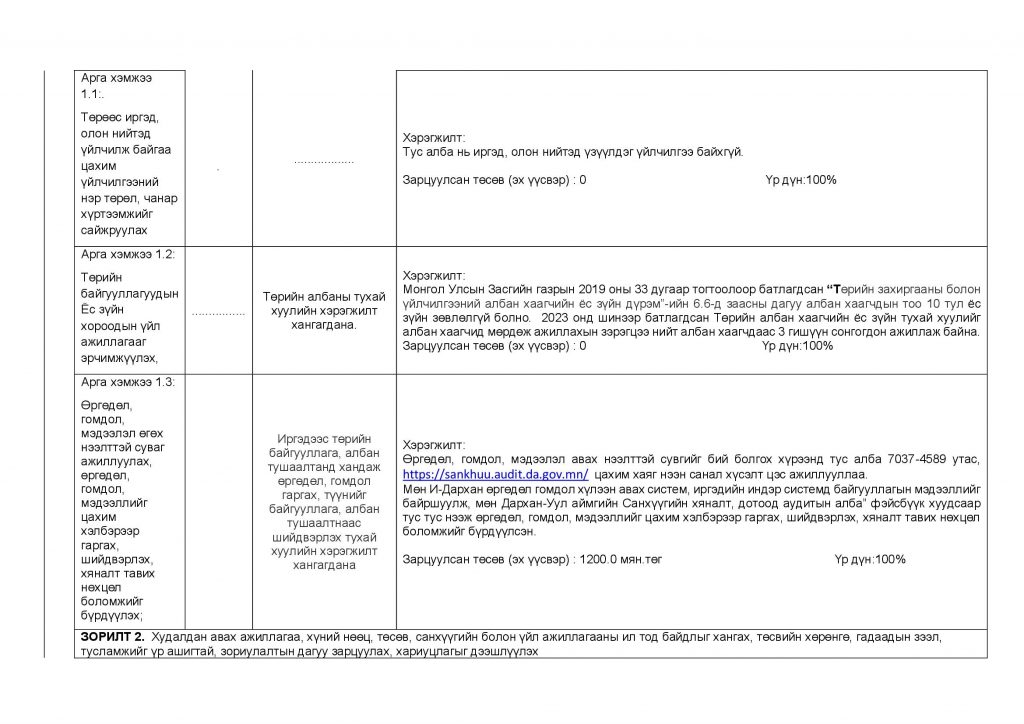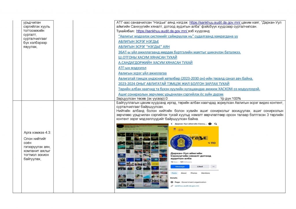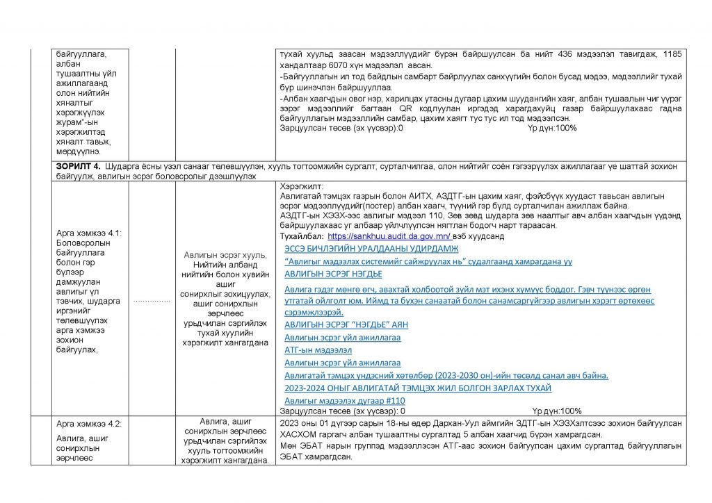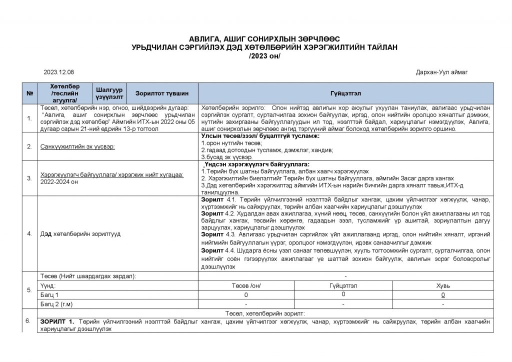 АВЛИГА, АШИГ СОНИРХЛЫН ЗӨРЧЛӨӨС УРЬДЧИЛАН СЭРГИЙЛЭХ ДЭД ХӨТӨЛБӨРИЙН ХЭРЭГЖИЛТ /2023 ОН/ Post published:12 сар 11, 2023 Post category:Авлигын эсрэг үйл ажиллагаа / ҮЙЛ АЖИЛЛАГААНЫ ТӨЛӨВЛӨГӨӨ You Might Also Like Албан хаагчид монгол бичгийн мэдлэгээ сорьлоо. 5 сар 9, 2023 СЭТГЭЛ ХАНАМЖИЙН СУДАЛГАА 9 сар 25, 2023 ДОТООД АУДИТЫН ХОРООНЫ ХУРАЛ БОЛЛОО. 12 сар 22, 2023