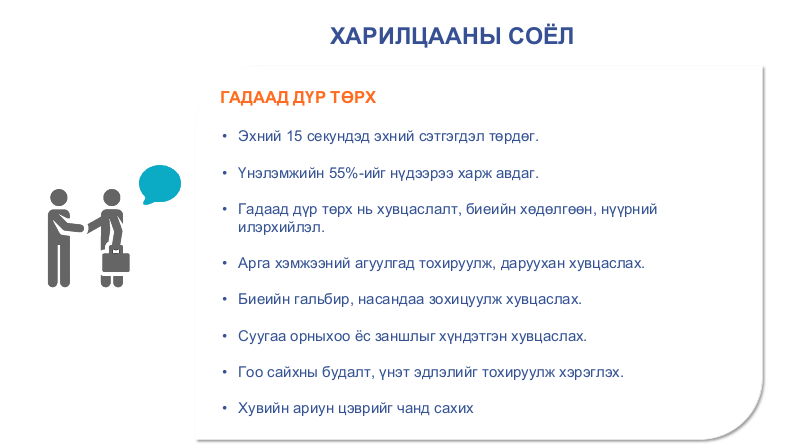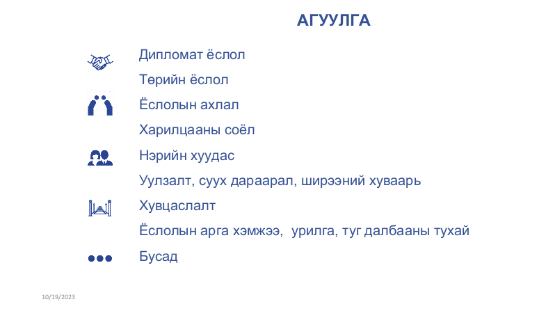 Төрийн байгууллага, албан хаагчдад харилцааны соёл, үйл ажиллагаандаа баримтлах дэг, жаягийг нийтлэг байдлаар танилцуулах, анхаарал хандуулах зарим асуудлаар танин мэдэхүйн болон практик мэдээлэл зөвлөмж өгөх зорилгоор ТАЗ-өөс зохион байгуулж буй 7:4:10 “Төрийн албан хаагч ба дипломат ёслол” сэдэвт цахим сургалтад 2023.10.19-ны өдөр албан хаагчид хамрагдлаа.