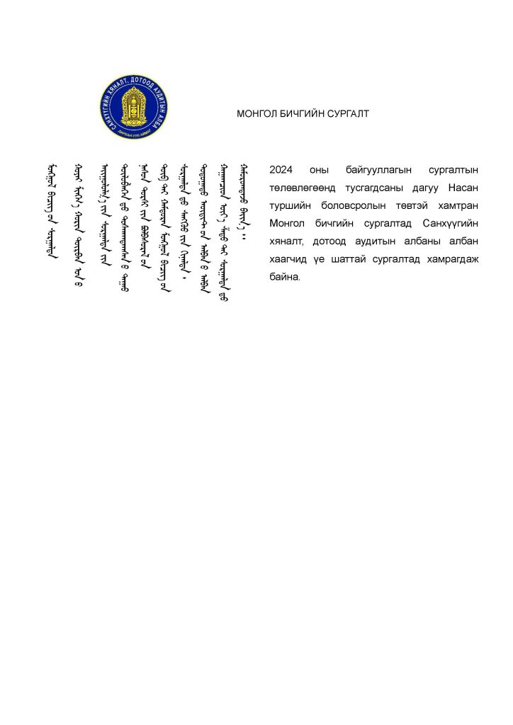 Сургалтад хамрагдлаа. Post published:10 сар 16, 2024 Post category:Мэдээ мэдээлэл / ҮЙЛ АЖИЛЛАГААНЫ ТӨЛӨВЛӨГӨӨ You Might Also Like ТӨРИЙН АЛБАНЫ ЗӨВЛӨЛИЙН 7:4:10 АРГАЗҮЙН ЦАХИМ СУРГАЛТАД ХАМРАГДЛАА. 4 сар 27, 2023 Нийтийн албан тушаалтан Та 2022 оны ХАСХОМ-ээ шинэчлэн бүртгүүлнэ үү 1 сар 2, 2023 Монгол улсад санхүүгийн алба үүсч хөгжсөний 112 жилийн ой, САНХҮҮЧДИЙН ӨДРИЙН БАЯРЫН МЭНДийг санхүү, эдийн засгийн мэргэжилтэн, ажилтан, албан хаагч нартаа хүргэе! 12 сар 11, 2023