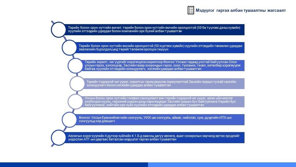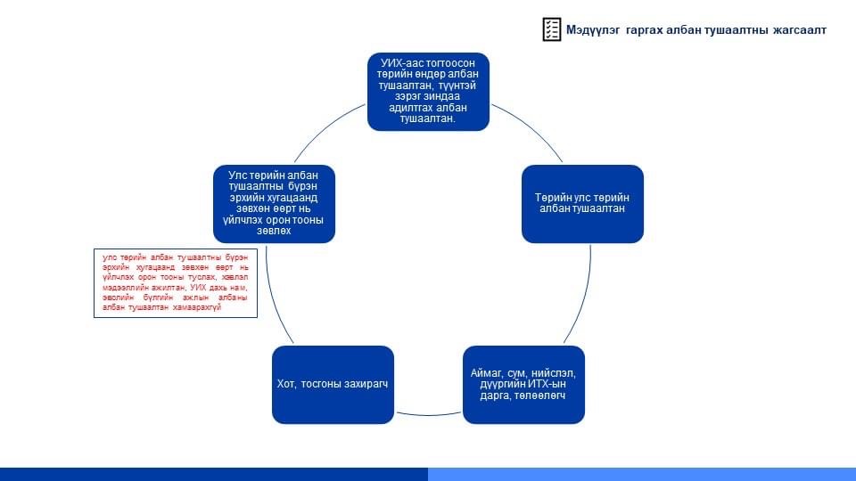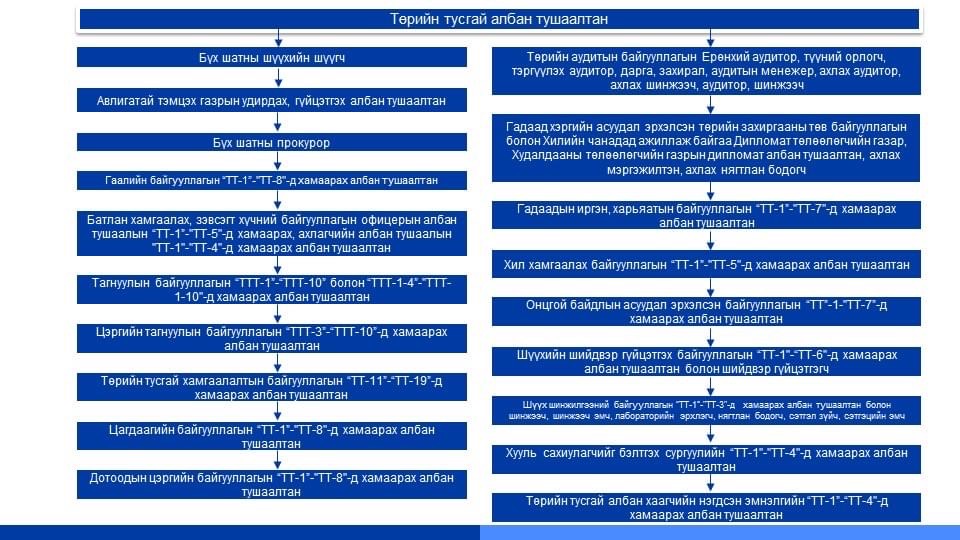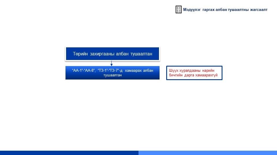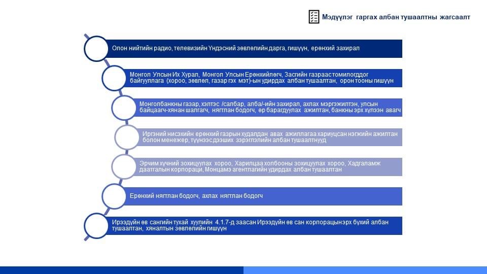 You are currently viewing МЭДҮҮЛЭГ ГАРГАХ АЛБАН ТУШААЛТНЫ ЖАГСААЛТ-ЫГ 2024.06.01-НИЙ ӨДРӨӨС ДАГАЖ МӨРДӨХӨӨР ТОГТООСОН.