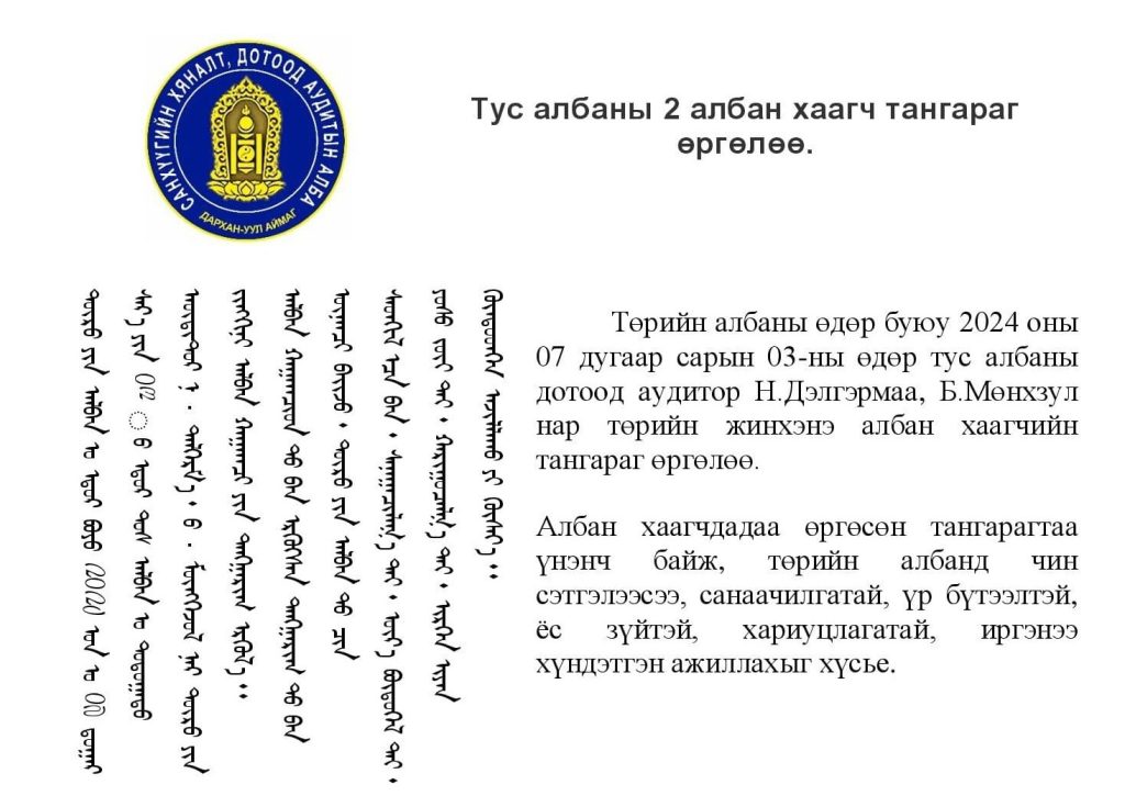 Тус албаны 2 албан хаагч тангараг өргөлөө. Post published:7 сар 3, 2024 Post category:Мэдээ мэдээлэл You Might Also Like Төрийн албан хаагчийн ёс зүйн зөрчлөөс урьдчилан сэргийлэх, соён гэгээрүүлэх үндэсний хөтөлбөр 2 сар 12, 2026 ЖУРАМД ӨӨРЧЛӨЛТ ОРУУЛАХ ТУХАЙ 2022 ОНЫ 491 ДҮГЭЭР ТОГТООЛ (Засгийн газрын 2018 оны 382 дугаар тогтоол төрийн алба хаасан хугацааны нэмэгдэл) 1 сар 10, 2023 Уриалга 8 сар 22, 2025