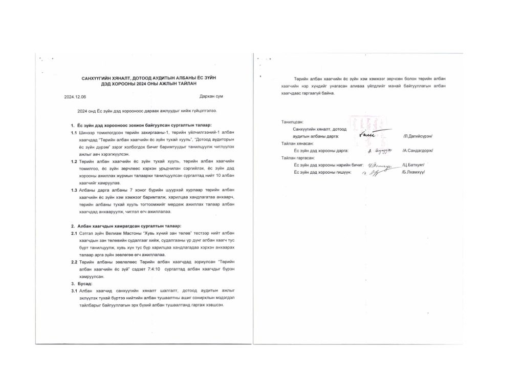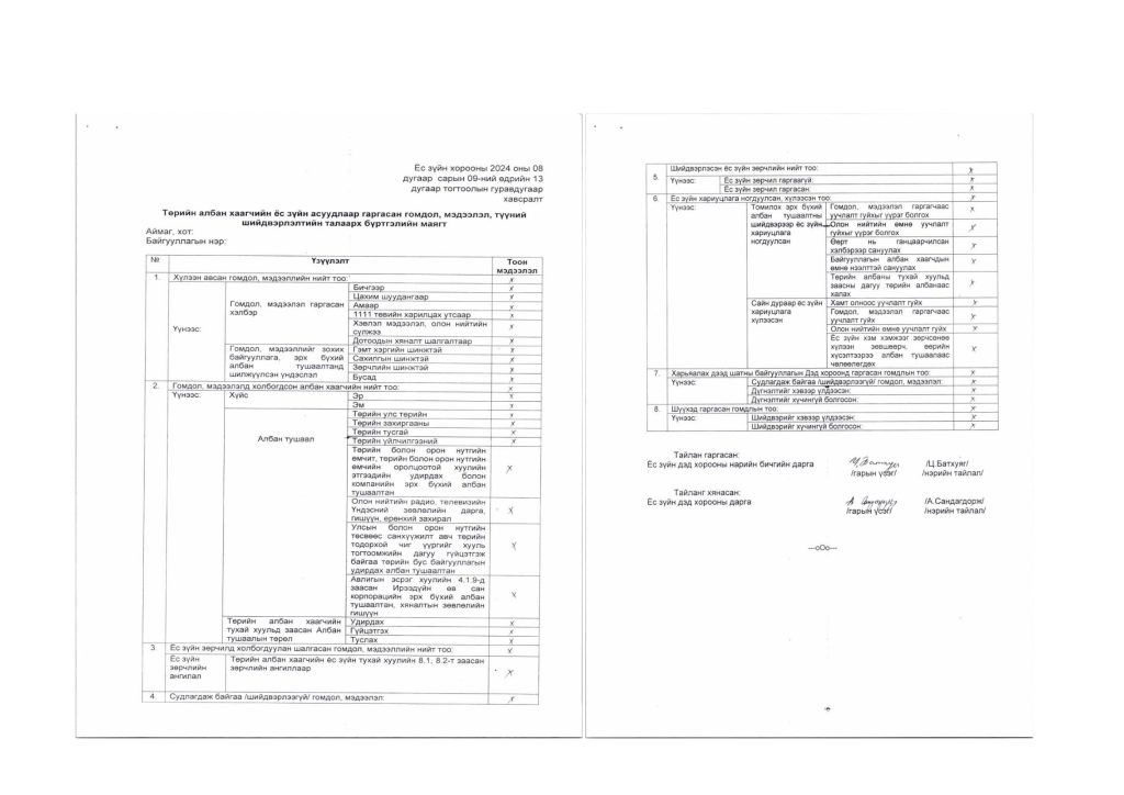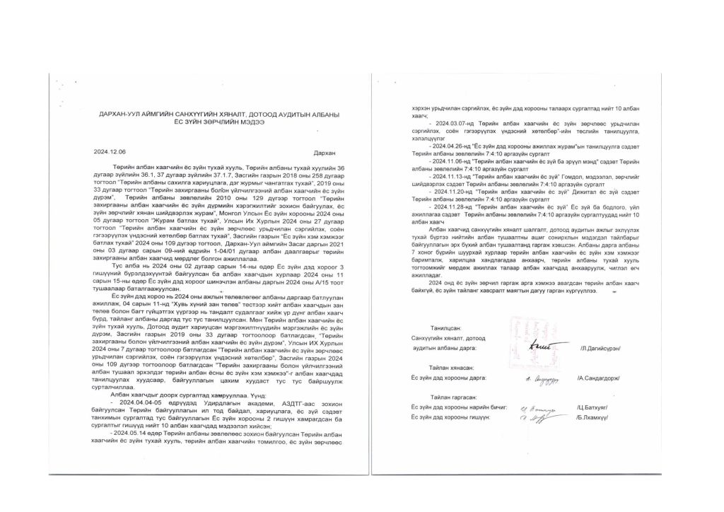 Ёс зүйн зөрчлийн мэдээ, байгууллагын ёс зүйн дэд хорооны тайлан Post published:12 сар 9, 2024 Post category:Ёс зүйн дэд хороо / ТАЙЛАН / ҮЙЛ АЖИЛЛАГААНЫ ТӨЛӨВЛӨГӨӨ You Might Also Like МЭНДЧИЛГЭЭ 4 сар 30, 2024 2024 ОНЫ 1 САР 1 сар 23, 2024 Дархан-Уул аймгийн Засаг даргын дэргэдэх Статистикийн хэлтэс 8 сар 9, 2024