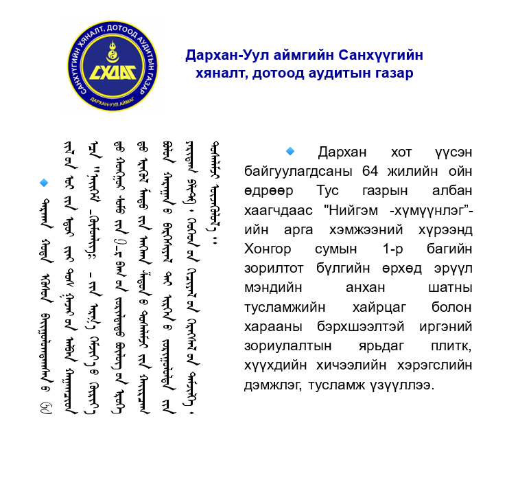 “БИДНИЙ ДАРХАН” НЭРЭМЖИТ АЖИЛ, ҮЙЛЧИЛГЭЭГ ЗОХИОН БАЙГУУЛАХ #УРИАЛГАД НЭГДЛЭЭ. Post published:10 сар 17, 2025 Post category:Мэдээ мэдээлэл You Might Also Like 2023 ОН Б-03 5 сар 5, 2023 АЛХАЛТ-10000 АЯН НЭГДЛЭЭ 5 сар 2, 2025 ХАСХОМ гаргах албан тушаалтны жагсаалтыг шинэчлэн баталлаа 5 сар 10, 2024