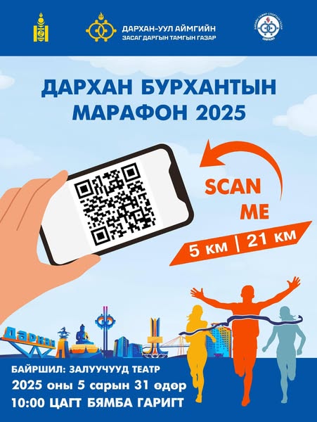 Монгол Улсын Сангийн сайд, УИХ-н гишүүн Б.Жавхлангийн санаачилгаар Дархан-Уул аймагт зохион байгуулагдах шагналын сан өндөртэй “Бурхантын-Марафон-2025” тэмцээн 5-р сарын 31-ний 10:00 цагт Найрамдал талбайд зохион байгуулагдах тул иргэд, аанб та бүхнийг хамт олноороо идэвхтэй оролцохыг уриалж байна.