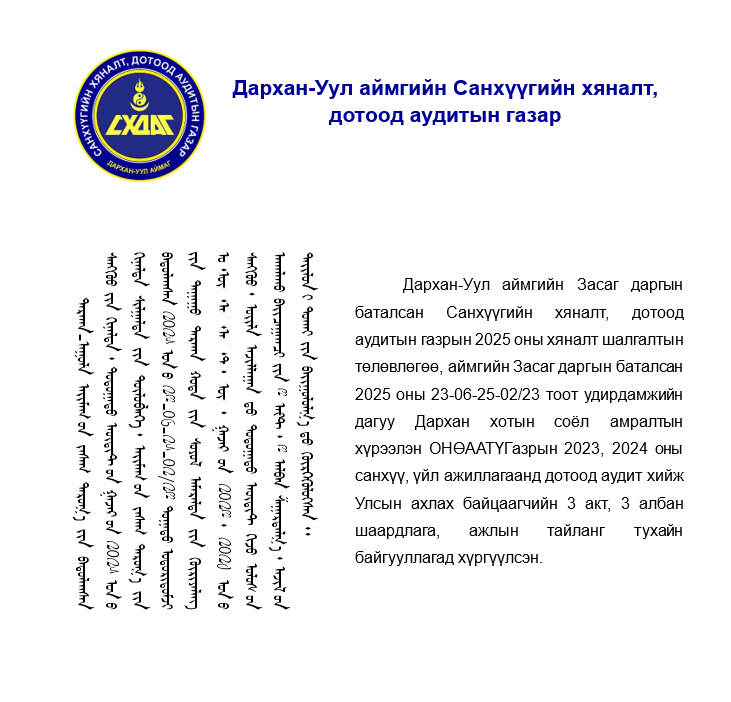 Дархан хотын соёл амралтын хүрээлэн ОНӨААТҮГазрын үйл ажиллагаанд дотоод аудит хийлээ.