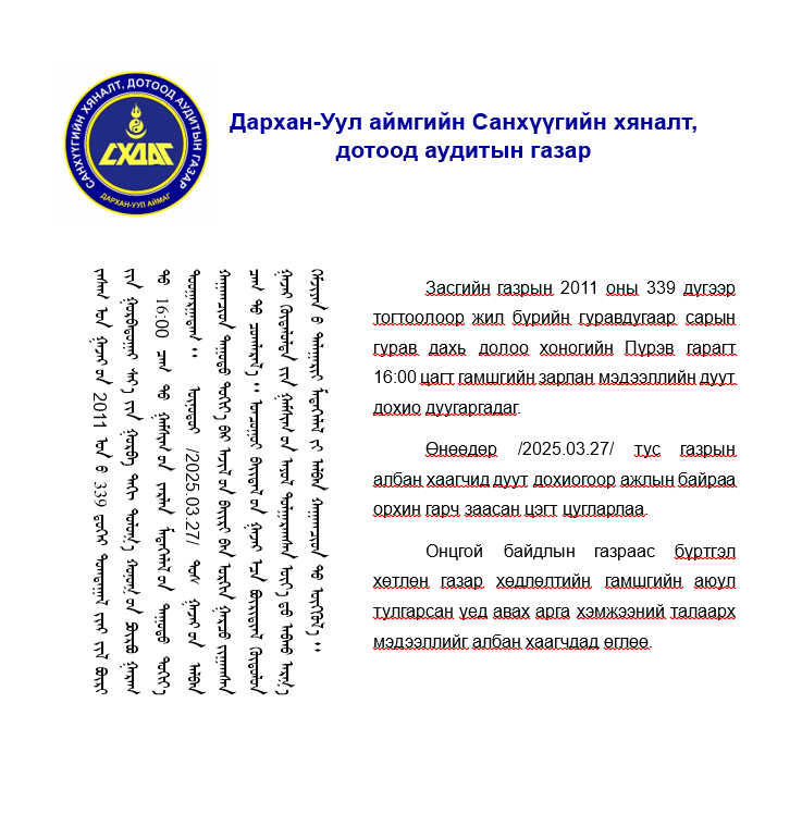 ЗАРЛАН МЭДЭЭЛЛИЙН ДУУТ ДОХИОГООР ДАДЛАГА СУРГАЛТАД ХАМРАГДЛАА Post published:3 сар 27, 2025 Post category:Мэдээ мэдээлэл You Might Also Like Зөв зөвд ШУДАРГА ЗӨВ соён гэгээрүүлэх аян 4 сар 16, 2025 “ЦАГААН САР” ЗӨВЛӨМЖ #2 2 сар 6, 2024 Хүүхдийн баярын мэндчилгээ. 6 сар 1, 2025