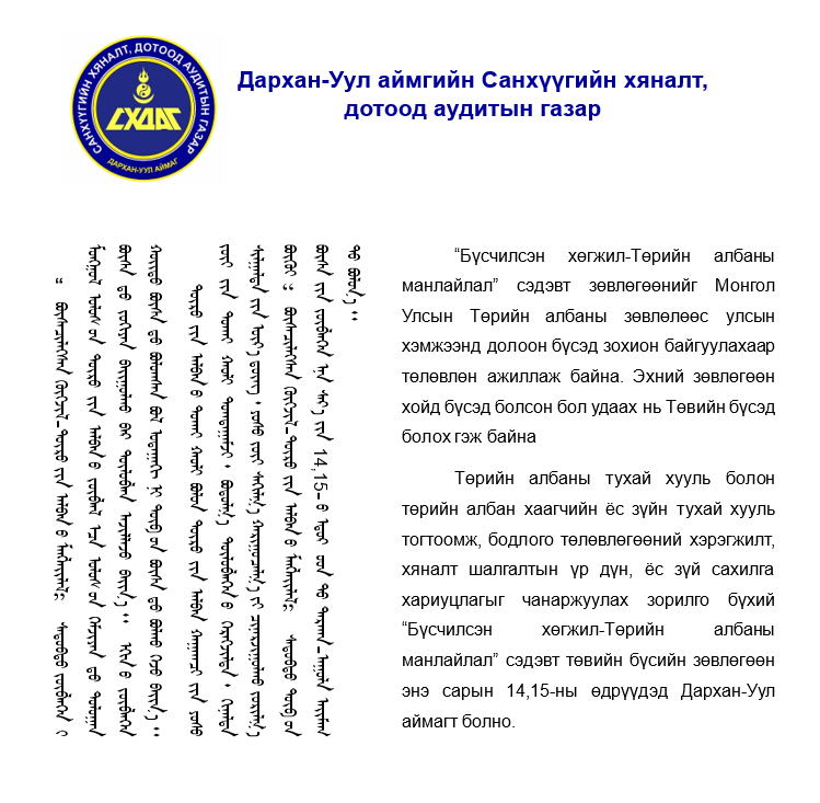 ТӨВИЙН БҮСИЙН ЗӨВЛӨГӨӨН ДАРХАН-УУЛ АЙМАГТ БОЛНО Post published:4 сар 11, 2025 Post category:Мэдээ мэдээлэл You Might Also Like САНГИЙН САЙД Б.ЖАВХЛАН МОНГОЛ УЛСЫН 2023 ОНЫ ТӨСВИЙН ТӨСЛИЙГ ӨРГӨН БАРИЛАА 10 сар 3, 2022 #АВЛИГЫН ЭСРЭГ ОЛОН УЛСЫН ӨДӨР 12 сар 9, 2022 МЭНДЧИЛГЭЭ 7 сар 3, 2024