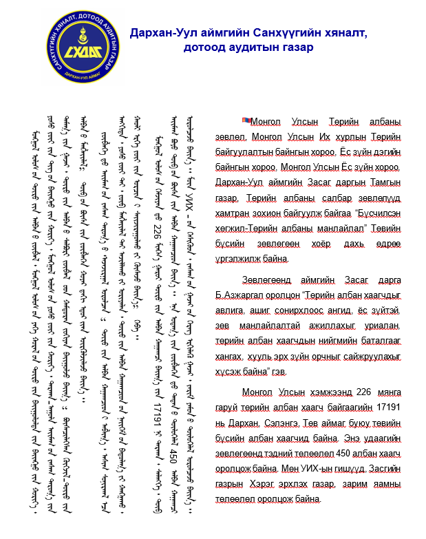ТӨВИЙН БҮСИЙН ТӨРИЙН АЛБАН ХААГЧДЫН ЗӨВЛӨГӨӨН ҮРГЭЛЖИЛЖ БАЙНА Post published:4 сар 15, 2025 Post category:Мэдээ мэдээлэл Дархан-Уул Аймаг is with Монгол Улсын Төрийн албаны Зөвлөл and Дархан-Уул аймгийн Төрийн албаны Салбар зөвлөл. You Might Also Like ЭЦЭГ, ЭХЧҮҮДИЙН АНХААРАЛД 1 сар 31, 2025 ЭЭЛЖИЙН АМРАЛТ эдлэх эрх хэрхэн үүсэх вэ? 8 сар 10, 2023 2023-2024 ОНЫГ АВЛИГАТАЙ ТЭМЦЭХ ЖИЛ БОЛГОН ЗАРЛАХ ТУХАЙ 3 сар 23, 2023