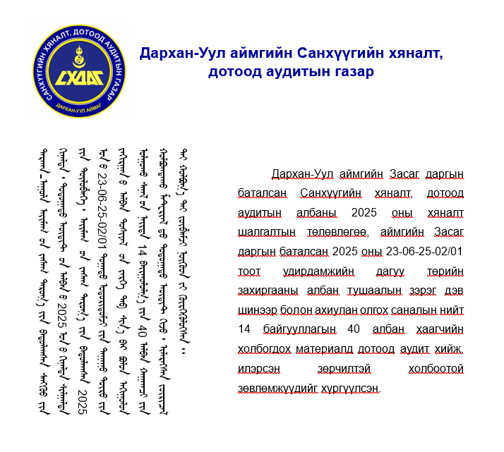 ДАРХАН УУЛ АЙМГИЙН САНХҮҮГИЙН ХЯНАЛТ, ДОТООД АУДИТЫН ГАЗАР