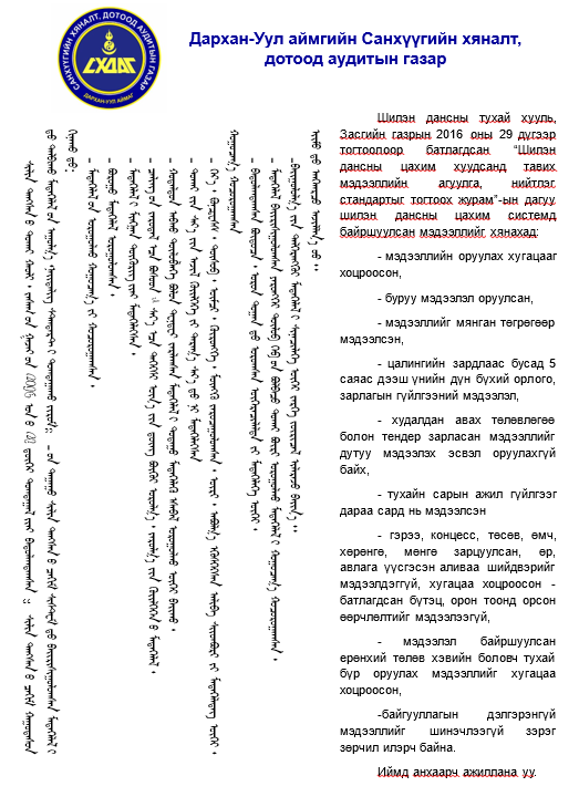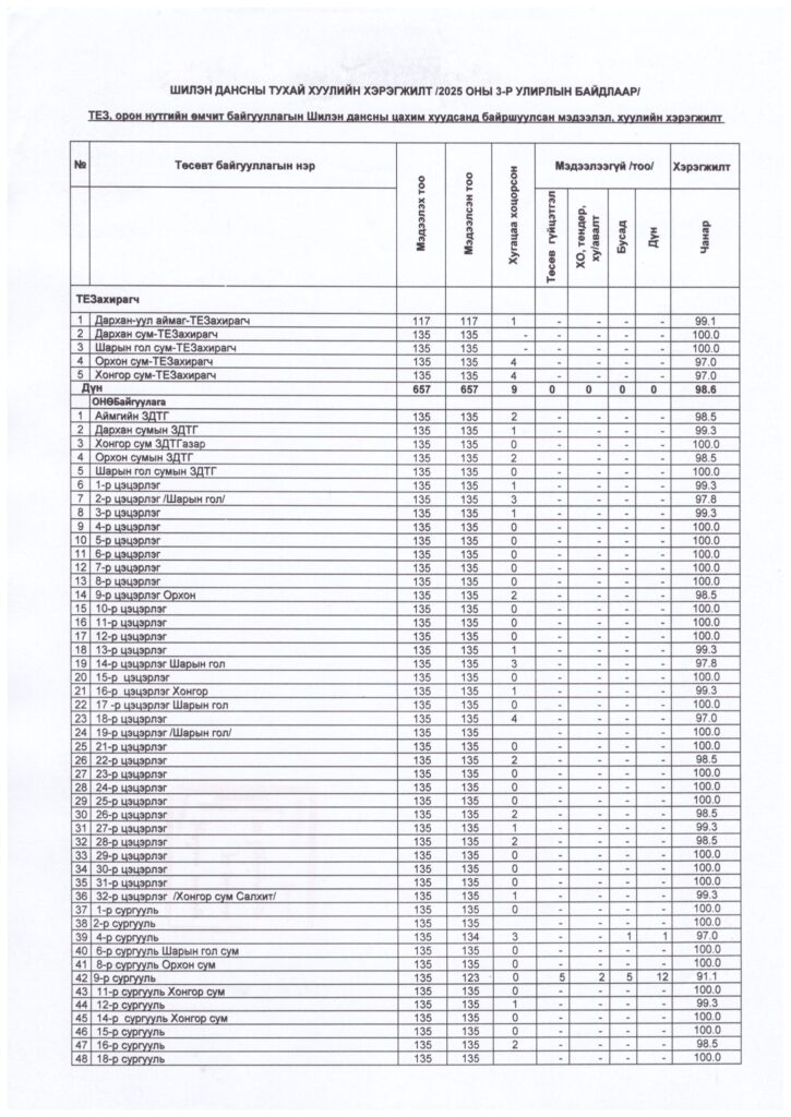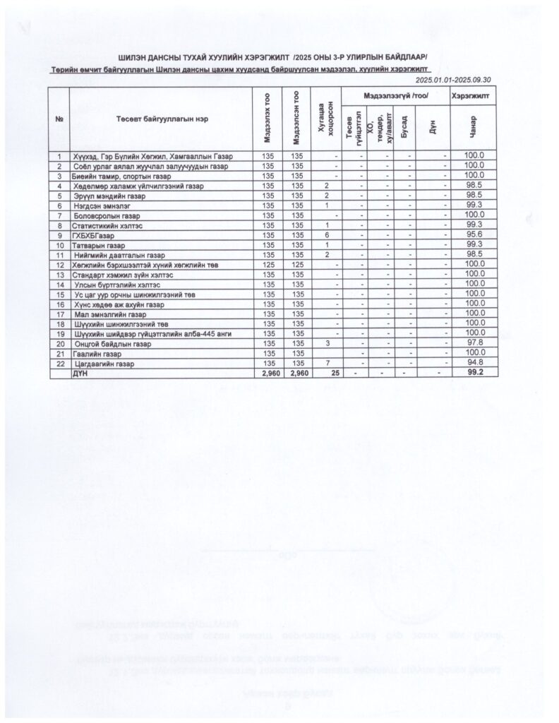 ШИЛЭН ДАНСНЫ ТУХАЙ ХУУЛИЙН ХЭРЭГЖИЛТ 2025 ОНЫ 3-Р УЛИРАЛ Post published:10 сар 31, 2025 Post category:ДОТООД АУДИТЫН ТӨЛӨВЛӨГӨӨ, ТАЙЛАН / Мэдээ мэдээлэл / ТАЙЛАН / ҮЙЛ АЖИЛЛАГААНЫ ТӨЛӨВЛӨГӨӨ You Might Also Like Дархан-Уул аймгийн Засаг даргаас олгох “Шагналын журам” шинэчлэн батлагдсан байна. 2 сар 7, 2023 Сайн байцгаана уу? 11 сар 23, 2023 Ажил гүйцэтгүүлэх тендер шалгаруулалтын жишиг баримт бичиг 7 сар 18, 2025