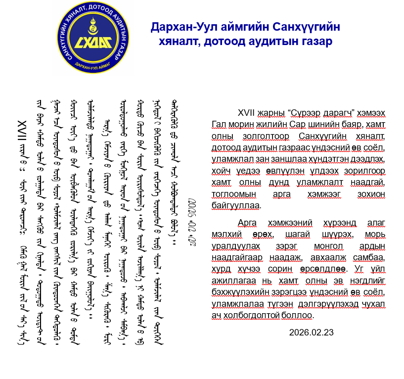 Сар шинийн золголт, уламжлалт наадгай, тоглоомын арга хэмжээг зохион байгууллаа. Post published:2 сар 23, 2026 Post category:Мэдээ мэдээлэл / ТАЙЛАН / ҮЙЛ АЖИЛЛАГААНЫ ТӨЛӨВЛӨГӨӨ You Might Also Like Сургалтад хамрагдлаа. 10 сар 16, 2024 САНГИЙН ЯАМНЫ НЭРЭМЖИТ “ЭРДЭМ ШИНЖИЛГЭЭНИЙ ХУРАЛ”-Д ОРОЛЦОХЫГ УРЬЖ БАЙНА. 2 сар 6, 2026 Шилэн дансанд мэдээлэл оруулах хугацаа болон оруулах мэдээллээ бүрэн оруулахад анхаараарай!!! 6 сар 6, 2025