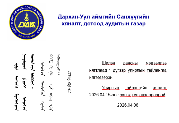 ДАРХАН-УУЛ АЙМГИЙН САНХҮҮГИЙН ХЯНАЛТ, АУДИТЫН АЛБА  © 2021 ОН . ВЭБ ХӨГЖҮҮЛСЭН EWEB.MN
