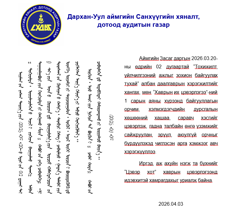 Орчны цэвэрлэгээ зохион байгууллаа. Post published:4 сар 3, 2026 Post category:Мэдээ мэдээлэл You Might Also Like НӨАТ-ЫН ТАЙЛАНГ ДАРАА САРЫН 10-НЫ ДОТОР ТУШААНА. 2 сар 2, 2024 АШИГ СОНИРХЛЫН ЗӨРЧЛӨӨС СЭРГИЙЛЭХ ТУХАЙ. 1 сар 5, 2024 Ёс зүйн дэд хорооны ажиллах журам 4 сар 17, 2024