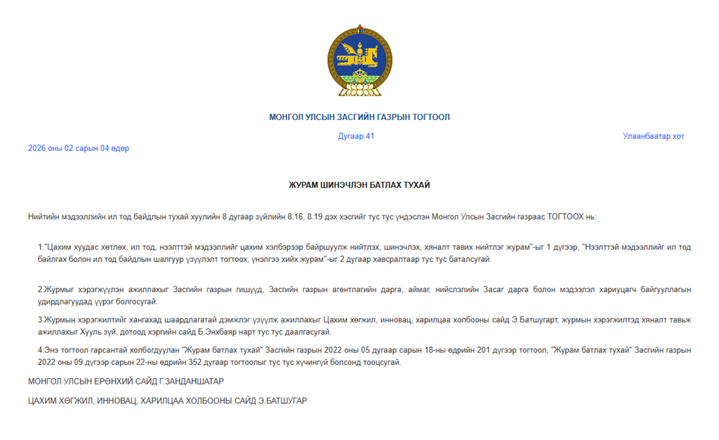 “Цахим хуудас хөтлөх, ил тод, нээлттэй мэдээллийг цахим хэлбэрээр байршуулж нийтлэх, шинэчлэх, хяналт тавих нийтлэг журам” Post published:4 сар 16, 2026 Post category:ЗГ-ЫН ТОГТООЛ / Мэдээ мэдээлэл https://legalinfo.mn/mn/detail?lawId=17435801087642 ЦАХИМ ХУУДАС ХӨТЛӨХ, ИЛ ТОД, НЭЭЛТТЭЙ МЭДЭЭЛЛИЙГ ЦАХИМ ХЭЛБЭРЭЭР БАЙРШУУЛЖ НИЙТЛЭХ, ШИНЭЧЛЭХ, ХЯНАЛТ ТАВИХ НИЙТЛЭГ ЖУРАМ НЭЭЛТТЭЙ МЭДЭЭЛЛИЙГ ИЛ ТОД БАЙЛГАХ БОЛОН ИЛ ТОД БАЙДЛЫН ШАЛГУУР ҮЗҮҮЛЭЛТ ТОГТООХ, ҮНЭЛГЭЭ ХИЙХ ЖУРАМ You Might Also Like Газрын багц хуулийн хэлэлцүүлэгт албаны албан хаагчид оролцлоо. 2 сар 16, 2023 Эрх бүхий албан тушаалтнуудад зориулсан гарын авлага шинэчлэн хэвлэгдлээ. 6 сар 6, 2025 Зөвлөмж 6 сар 6, 2025