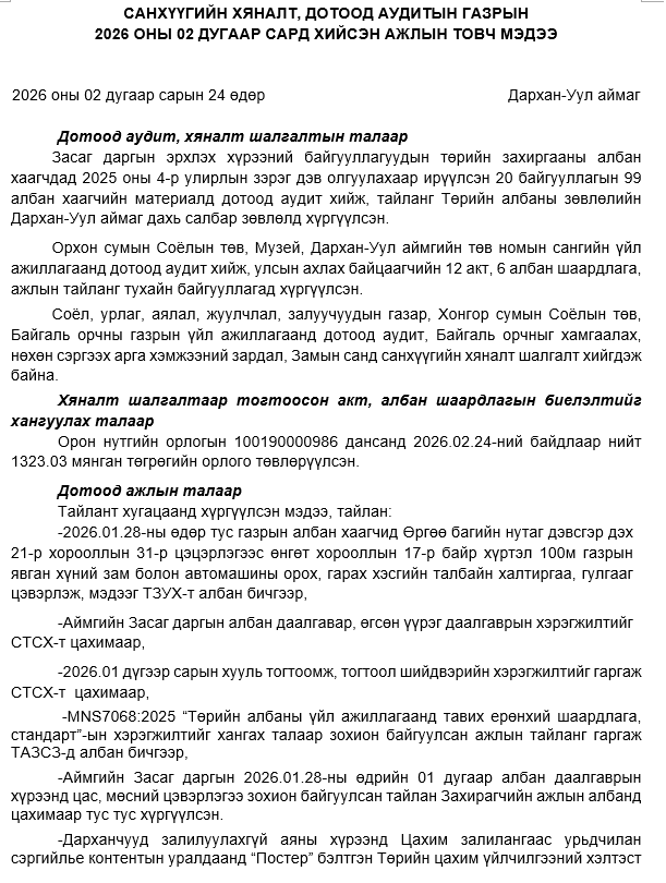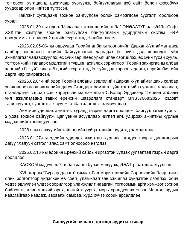 2026 оны 02 сар Post published:2 сар 24, 2026 Post category:АЖЛЫН МЭДЭЭ You Might Also Like 2022 ОНЫ 1 САР 1 сар 24, 2022 2023 ОНЫ 3 САР 3 сар 24, 2023 2025 оны 05 сар 5 сар 23, 2025