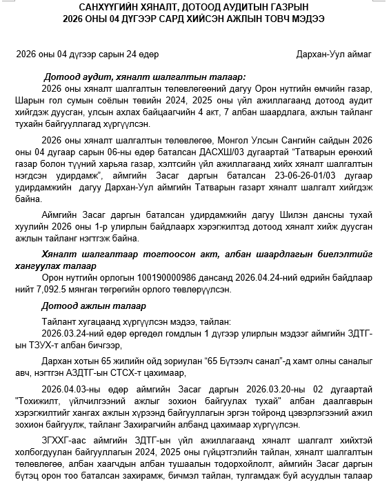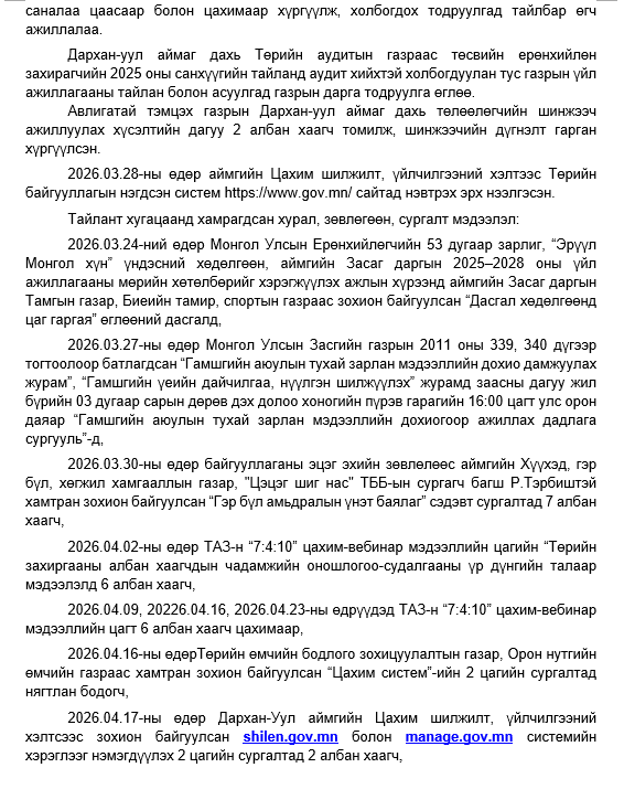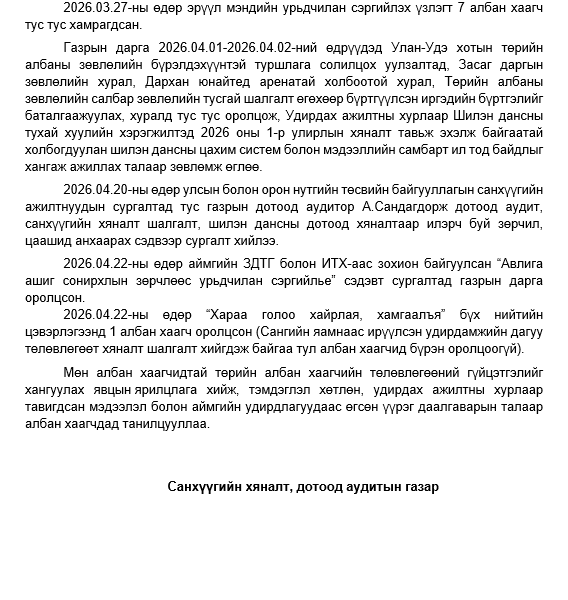 2026 оны 4 сар Post published:4 сар 24, 2026 Post category:АЖЛЫН МЭДЭЭ You Might Also Like 2023 ОНЫ 5 САР 5 сар 26, 2023 2023 ОНЫ 9 САР 9 сар 22, 2023 2022 ОНЫ 6 САР 6 сар 23, 2022